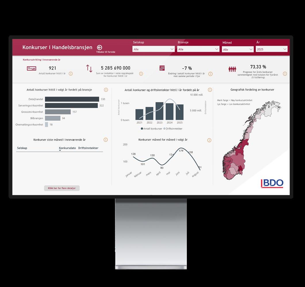 Det interaktive konkursanalyseverktøyet oppdateres normalt ukentlig med oppdaterte tall for selskaper som er registrert innenfor overnattings- og serveringsvirksomhet, reparasjon av motorvogner og varehandel. På grunn av fornyelse av avtale for innhenting av data, er siste oppdaterte tall per 18. august 2025. Videre oppdateringer vil komme månedlig. Verktøyet er offentlig tilgjengelig på BDOs nettsider.1