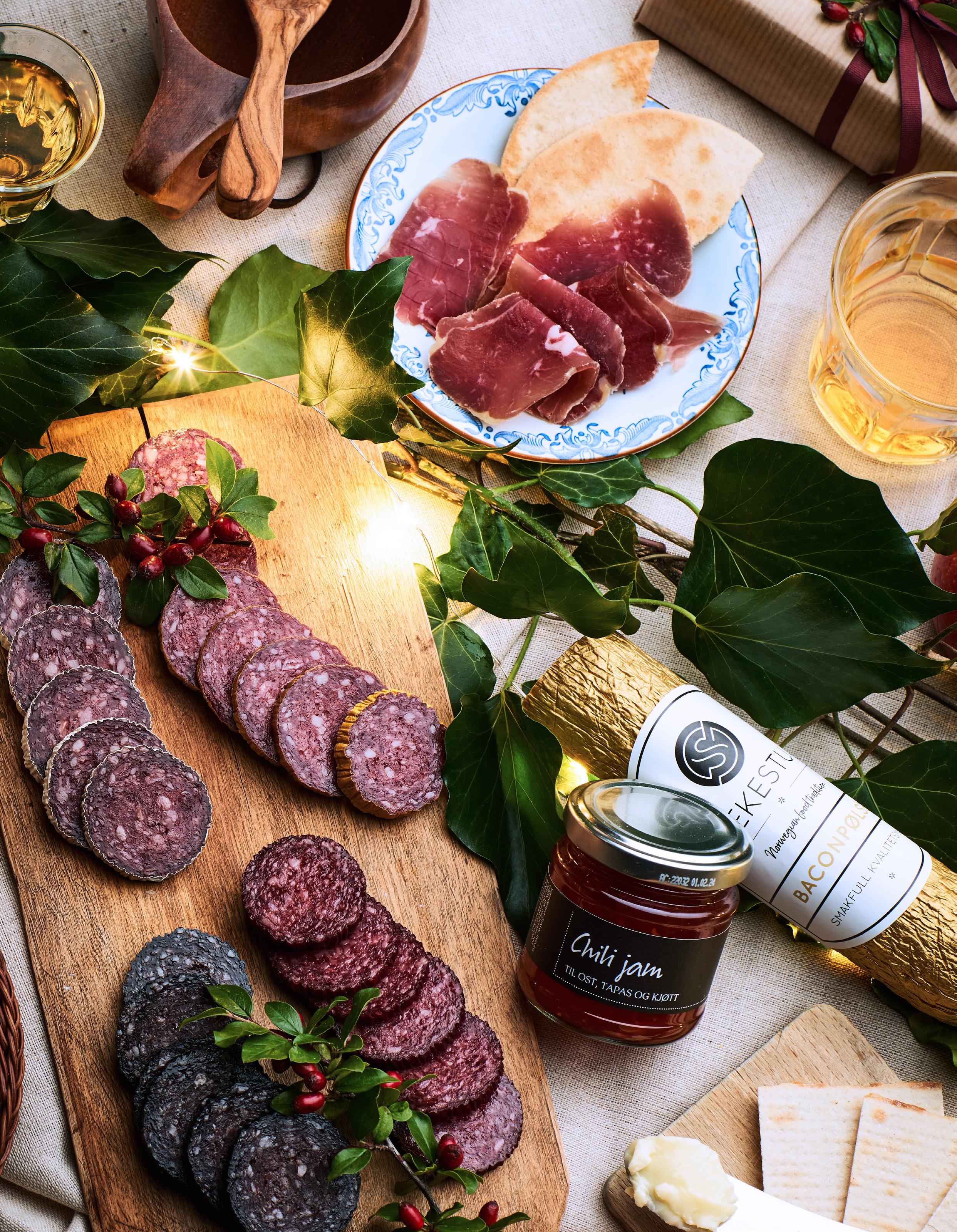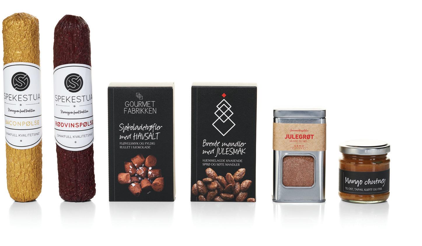 En spennende gavepakke med Spekestua rødvin- og elgpølse, chilijam og sjokoladetrøfler med havsalt.