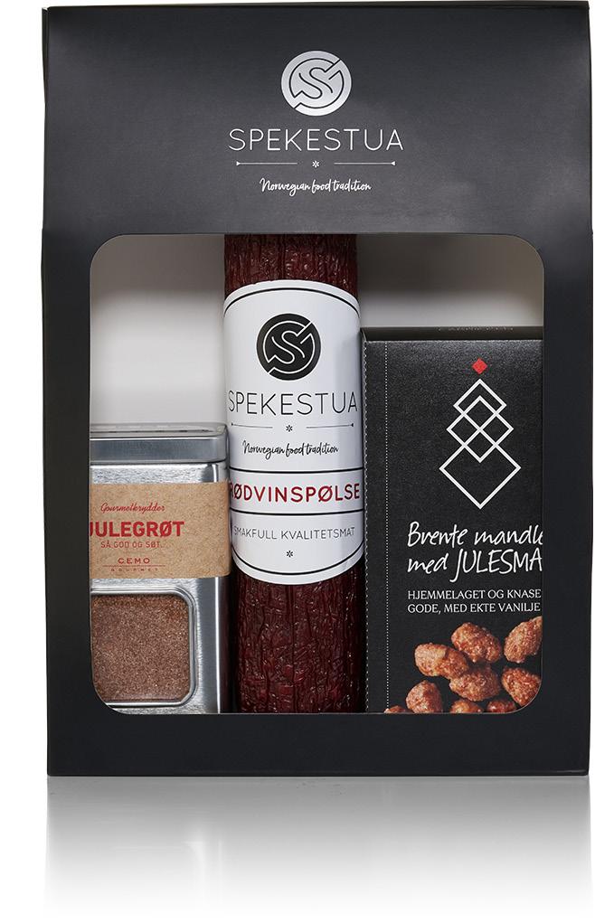 Gavepakke med smak av jul. Pakken inneholder krydder til julegrøt, brente mandler og Spekestua rødvinspølse.