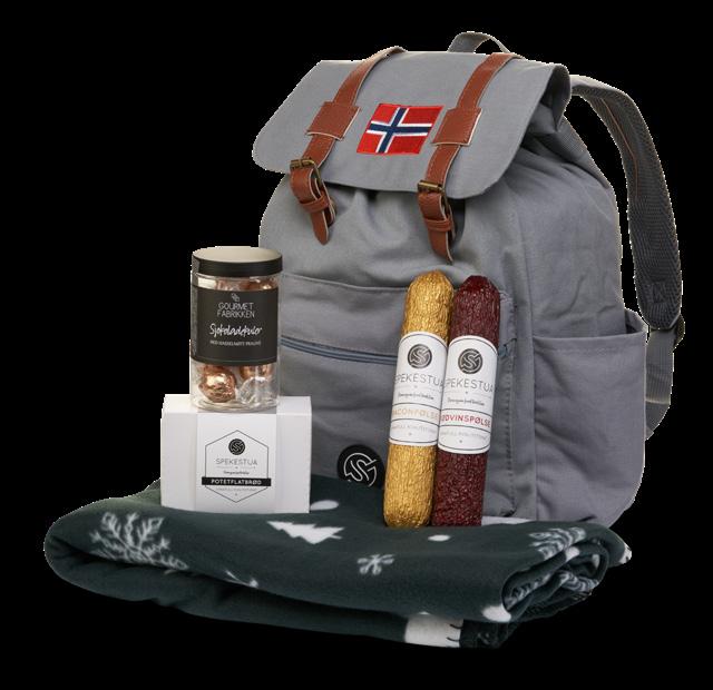 Spekesekk som inneholder Spekestua rødvin- og baconpølse, potetflatbrød, kaffe, lakris jordbær, brente mandler, sjokoladetrøfler med havsalt og pledd.