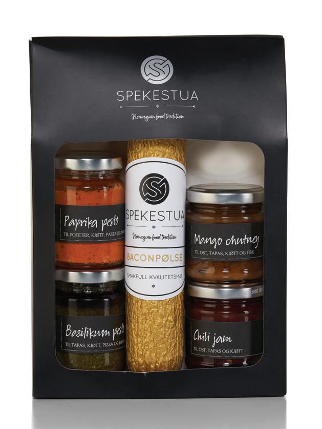 vår tapas-gavepakke! Pakken inneholder paprika- og basilikumpesto, mangochutney, chilijam og Spekestua baconpølse. Art.nr. 22-2020