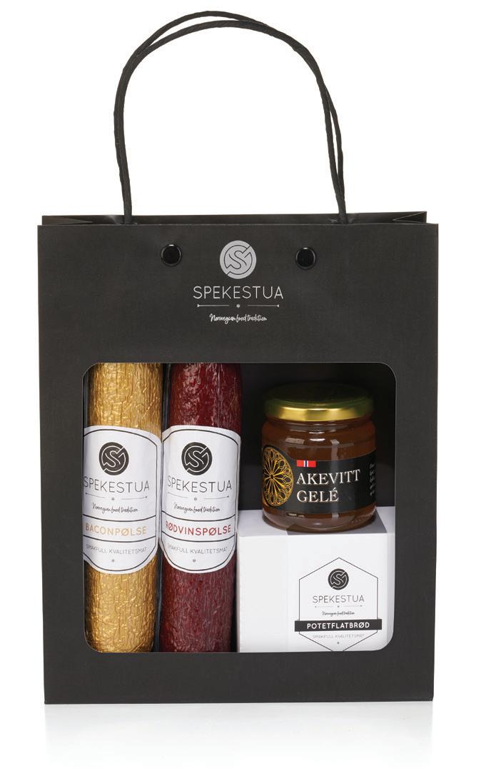 I denne gaveposen finner du gode råvarer for et skikkelig festmåltid. Posen inneholder Spekestua baconog rødvinspølse, akevittgelé og potetflatbrød. Art.nr. 22-2011