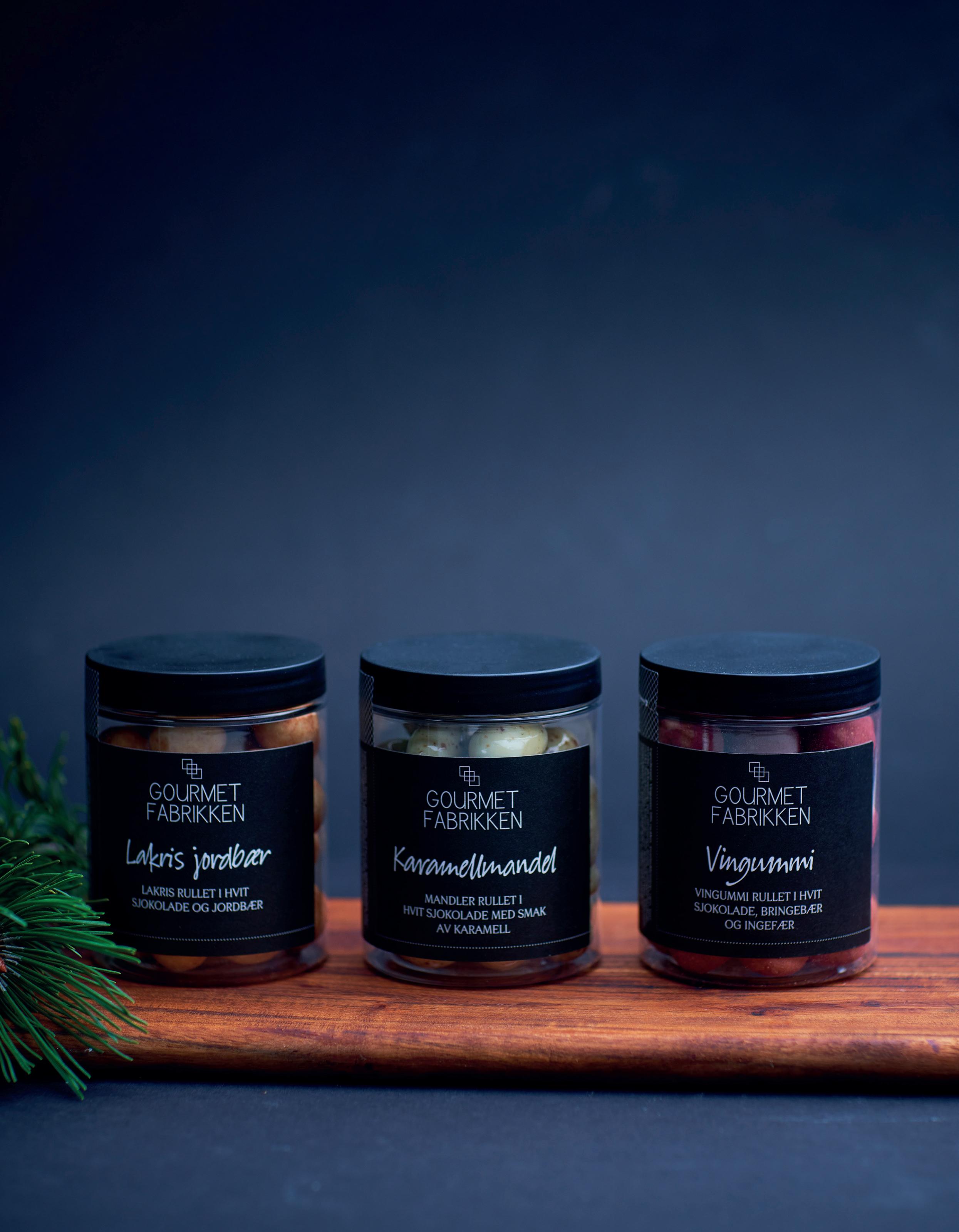 Gavepose med lakris jordbær, peppermyntedrops, brente mandler, sjokoladetrøfler med havsalt og kaffe.