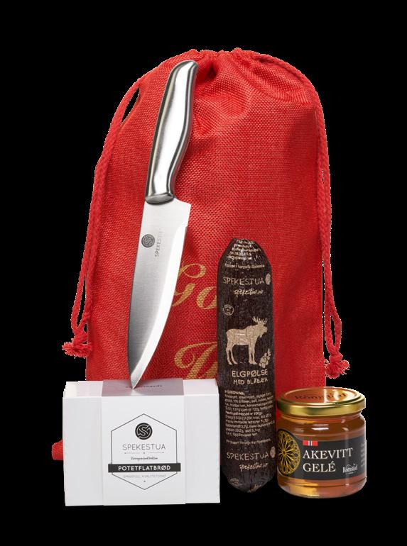 Julesekk med akevittgelè, potet flatbrød, elgpølse med blåbær og Spekestua kniv, pakkes i julepose.