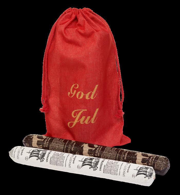 Julesekk med viking- og elgpølse med blåbær, pakkes i julepose.