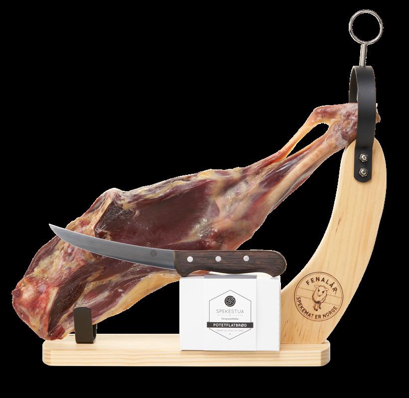 Ca 2 kg fenalår med fenalårstativ, potetflatbrød og Spekestuakniven.