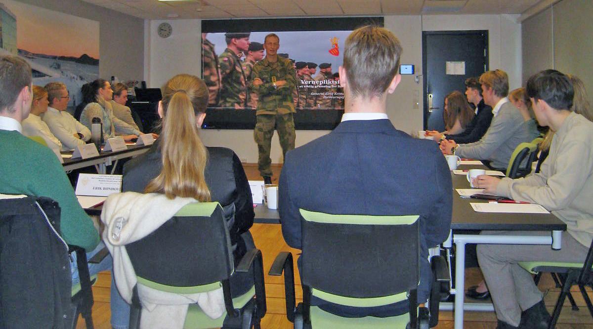 Etter lunsj var det to vernepliktige som holdt sine foredrag om sine syn på den militære førstegangstjenesten. Først ute var menig Amalie Slinde som tjenestegjør ved Garnisonen i Sør-Varanger på grensa mot Russland. Hun snakket om sin opplæring som soldat og om hun etter snart ett års