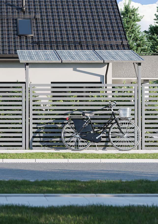 A P302 fence with a PS005 decorative module was used between the post of the carport.