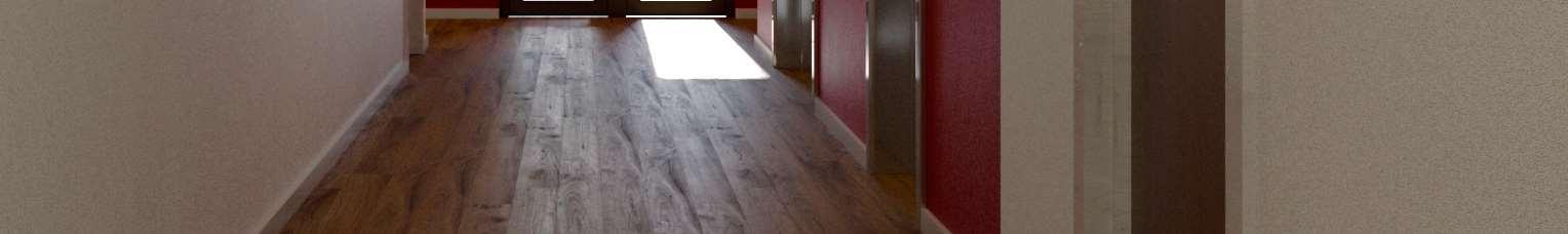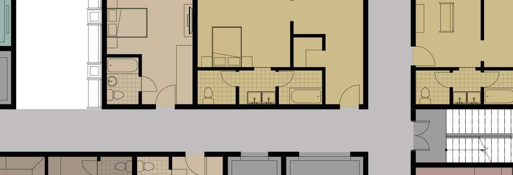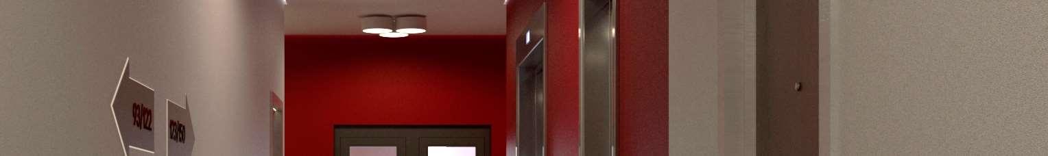 Interiér chodby je navržen tak, aby se v něm dalo snadno orientovat, a hlavní části budovy - výtahy a schodiště - jsou zvýrazněny červenou barvou.