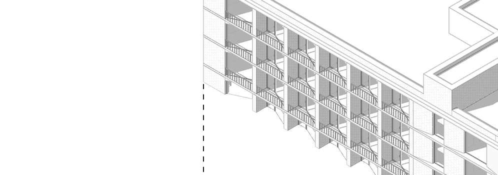 Jednotlivá patra jsou od sebe oddělna vystupujícími tmavě šedými podlhovými deskami, překrytí tmavě šedé barvy.