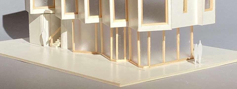 Aby fasády získaly objem a plasticitu, byly vytvořeny zkosené stěnové prvky, které vytvářejí hru světla a stínu.