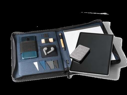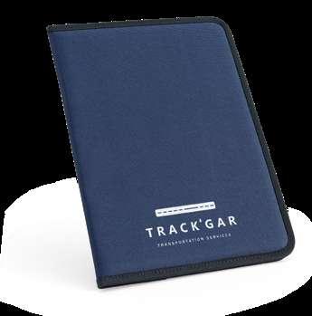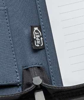300 D rPET A4 folder with zipper. 210D rPET lining with multiple pockets, smartphone compartment up to 6.5’’, pen holder (pen not included) and a notebook with 20 white lined sheets of FSC certified paper from sustainable forest management. Supplied in a non-woven pouch.