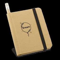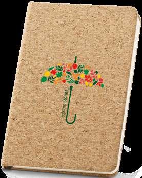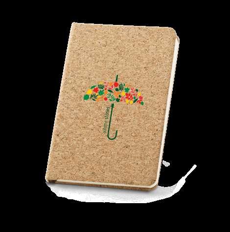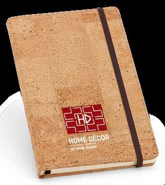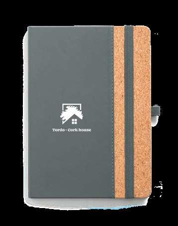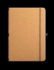 A5 notepad with cork and PU hardcover, with 192 lined ivory pages. This notepad has an elastic band, bookmark ribbon and pen holder (pen not included). Supplied in a non-woven pouch.