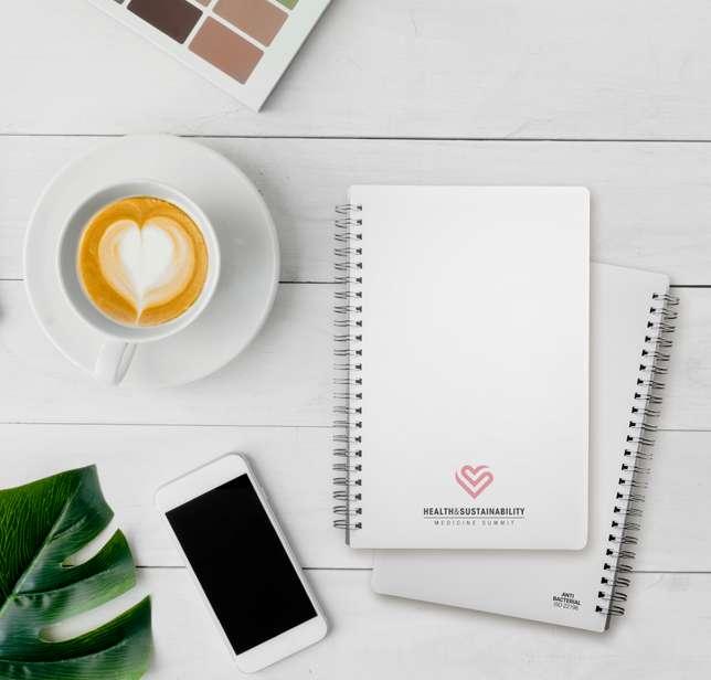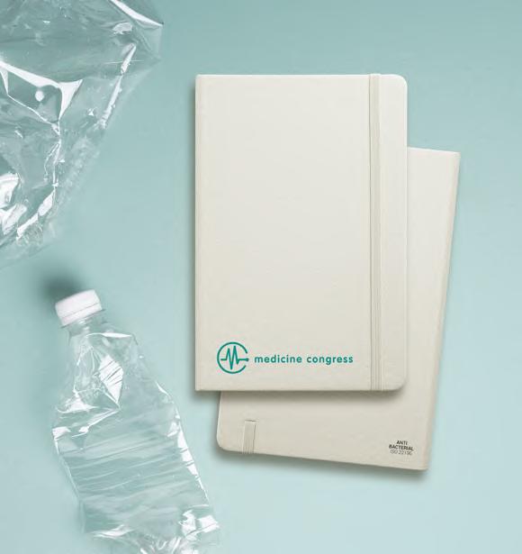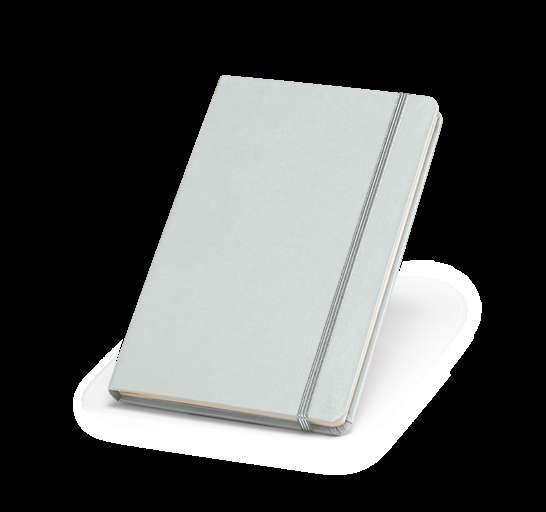 A5 notebook in recycled PET with antibacterial treatment, according to ISO22196 certification. Contains 160 lined ivory pages from a sustainable forest management, elastic band and bookmark ribbon.