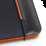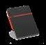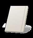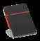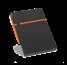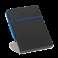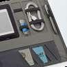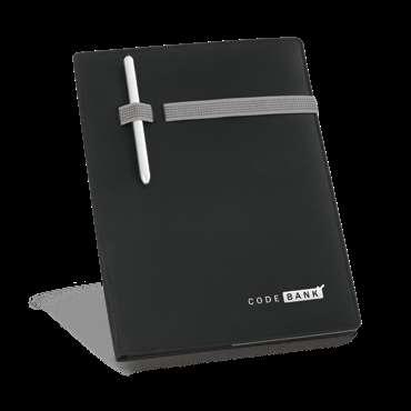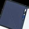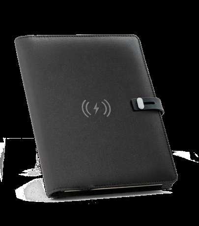 300D rPET A5 folder with built-in wireless charger. The battery has a capacity of 5.000 mAh, 5 W power, 5V/2.1A input/output and USB type C cable to charge it. The folder contains a smartphone pocket inside for a device up to 6.5’’, 3 card slots, 4 LED lights, on/off button, ball pen holder (not included), smartphone and USB cable, a notepad with black cardboard cover and 64 ivory-colored sheets of FSC-certified paper from sustainable forest management. On the front there is also an oval print in black to indicate the wireless charging area. Supplied in a cardboard gift box.