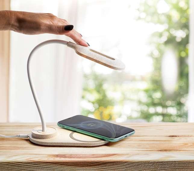 ABS and wheat straw fiber desk lamp with wireless charger. The lamp arm has a flexible design to adjust the light direction and has 20 LEDs that allow up to 3 levels of illumination. At the top of the lamp there is a touch button to turn on, off and adjust the lighting levels. The wireless charger is fast charging, having a power up to 10W, with 5V/2A and 9V/1.67A inputs. In the area where the equipment is placed there is a silicone circle to prevent it from moving. It includes a 1 m micro USB cable. Supplied in kraft paper box.