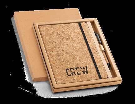 Set of A5 notepad and cork ball pen. Notepad with 192 lined ivory pages from a sustainable forest management.Ball pen with blue ink. Supplied in a cardboard gift box.