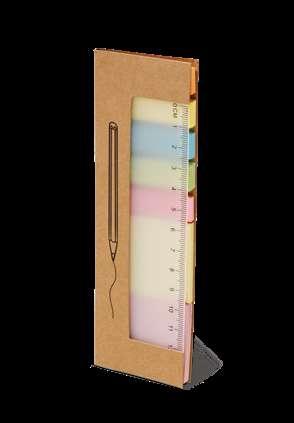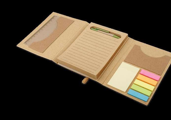 Office set with notepad (160 recycled pages), 6 sets of sticky notes (25 sheets each), 12 cm ruler, 1 ballpoint (kraft paper), business card holder and cardboard cover with elastic band.