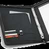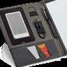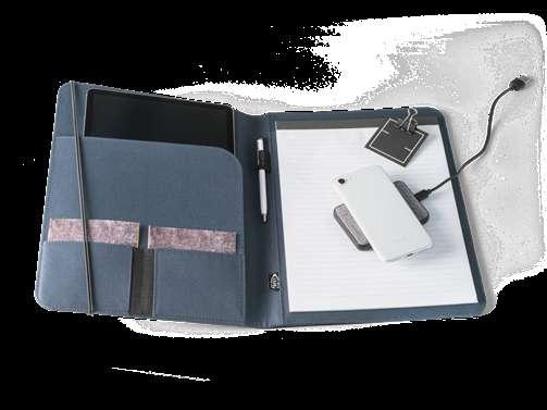 Imitation leather A5 folder with built-in portable battery. The lithium battery has a capacity of 4,000 mAh, life time ≥ 500 cycles, with 5V/1A input/output and USB/micro USB cable to charge the battery. This folder contains a pen holder (pen not included), a removable pad 64 ivory lined sheets, several compartments to facilitate organization and support for a smartphone. Customizable plate with rubber finish on the exterior, interior LED and on/off button. Supplied in a gift box.