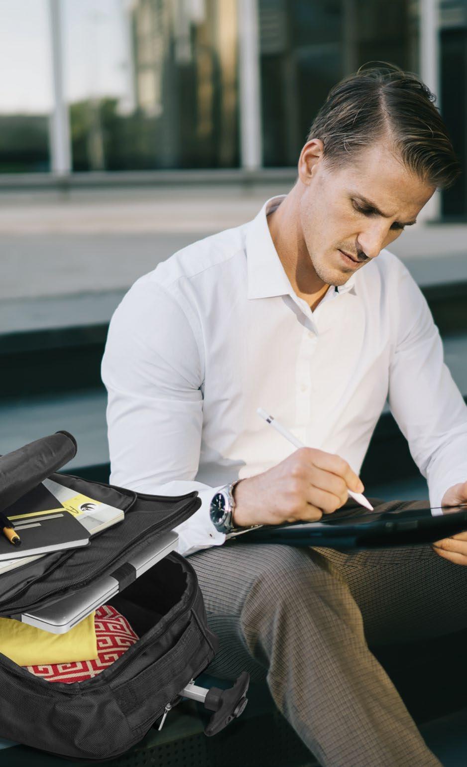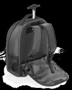 Laptop trolley backpack in 1680D and 300D. It’s main compartment is padded and cuchioned has a divider for a laptop up to 17’’. It contains 2 front pockets and 2 zippered side pockets. This trolley has a wheel protector, padded handles, extendable metal spring grip and removable magnet metal plate for customisation. It has capacity up to 22 L and weighs 1.80 kg. Metal plate custamisable with laser supplied seperately.