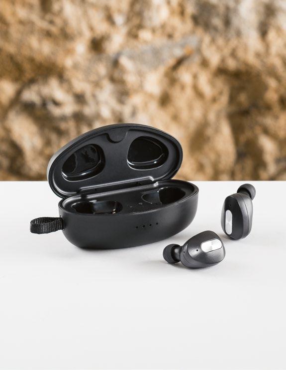 The VIBE are true wireless ABS earphones with Bluetooth 5.0. Perfect to carry anywhere as the storage case also serves as a charger with 800 mAh capacity and LED indicator. Never run out of music during your day, nor worry about the rain, as they are water resistant. They also have a built-in microphone and touch control. Supplied in a black gift box with charging cable.