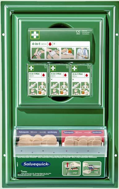 Stasjonen er også utrustet med Salvequick Plasterautomat og inneholder et ekstra rom for egne tilvalg, f.eks. Blodstopper, beskyttelsesbriller eller hansker.