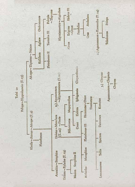 Tantalos raubt die Speise der Götter, schlachtet Pelops, seinen Sohn, setzt ihn den Göttern vor. Die Götter erkennen die Mahlzeit, nur Demeter isst von einer Schulter. So bestrafen sie den Raub: Tantalos hängt an einem Obstbaum, der unter einem schwebenden Felsen in der dreifach ummauerten Mitte des Hades aus einem Teich wächst, in ewigem Hunger zwischen den Früchten, Durst über dem Wasser, Angst unter dem Stein. Die Götter verfluchen sein Geschlecht. Niobe, Tochter des Tantalos, hat zwölf Kinder. Sie prahlt vor den Göttern mit ihrer Fruchtbarkeit, Apollon und Artemis töten die zwölf Kinder mit zwölf Pfeilen. Zeus verwandelt die schreiende Mutter in ihr eigenes Standbild. Im Frühsommer weint der Stein. Thyestes, Sohn des Pelops, bricht die Ehe seines Bruders Atreus. Atreus erschlägt die Söhne seines Bruders und bewirtet ihn mit ihrem Blut und Fleisch. Thyestes tut seiner eigenen Tochter Gewalt an. Ihr Sohn Aigisthos tötet Atreus. Agamemnon, Sohn des Atreus, entführt Klytaimnestra, tötet ihren Mann und nimmt sie zur Frau, sein Bruder Menelaos, ihre Schwester Helena. Helena wird von Paris verführt, folgt ihm nach Troja, der trojanische Krieg beginnt. Zum ersten Kriegsopfer bestimmt ein Seherspruch Iphigenie, Tochter von Klyaimnestra und Agamemnon. Klytaimnestra widersetzt sich, Agamemnon gehorcht, er legt Iphigenies Hals unter das Beil.