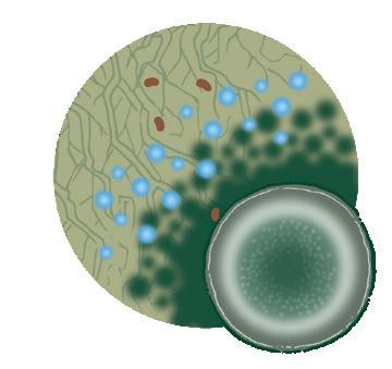 Trichoderma coloniza o sistema radicular da planta competindo com fitopatógenos por espaço e alimento. Antibiose