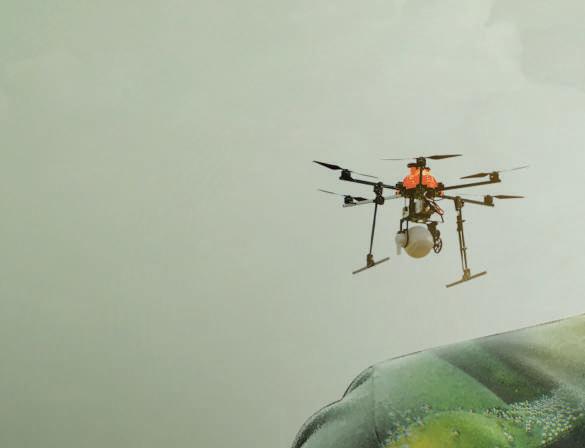 A tecnologia Natutec de liberação via drones distribui os ovos a granel de um hospedeiro alternativo, parasitado pela vespa Trichogramma, diretamente na cultura afetada, por meio de um dispenser rotativo preciso.