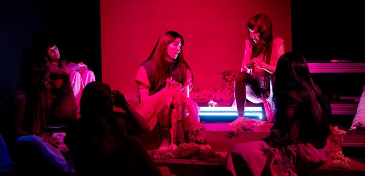 In einer Welt, in der Anderssein einem Akt der Rebellion gleicht, entfaltet sich 1626 in Würzburg der Kampf einer Hexenzunft gegen Ausgrenzung und Hass. Meanwhile in our near future other witches seek for transcendence in exile. Connected through the echo of queer love, the lives of the witches interweave across the generations on stage. Das Stück ist eine Ode an die Ausgestoßenen und die Kraft der Verbindung in einer Welt der Verfolgung. Für den queeren Spielklub von DT Jung* erarbeitete ich einen immersiven Raum mit zwei Polen – eine Seite des Raumes entsprach einer alten, vermoderten Welt, die andere einem traumhaften, paradiesischen Zustand. Beide Seiten sind miteinander verbunden, sodass Begegnungen und Zwischenräume entstehen. Da das Bühnenbild quer in der Box des Deutschen Theaters ähnlich eines Laufstegs liegt und das Publikum drum herum sitzt, werden alle im Raum gleichermaßen Teil der Begegnungen und biografischen Erzählungen und Offenbarungen des Ensembles.