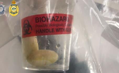 르투갈 여행자는 1.6kg의 코카인을 뱃 속에 넣은 채 시드니로 반입하려 했지 만 수하물 검사에서 코카인(Cocaine)이 발견된 후 세인트 조지 병원(St George Hospital)에서 CT 스캔을 받고 무게가 약 16g인 100개의 코카인 알갱이를 배설했 다. 호주 연방 경찰 검사관 대리인 제임스