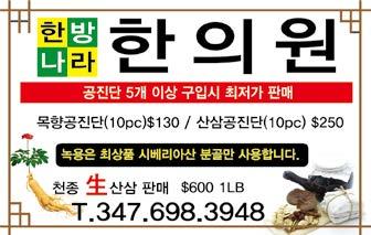 ☎ 917-285-6409 (영어/스페니쉬) ☎ 516-749-1744(이재숙선교사) ● 청일의 한 달 내 치료 보장 (12번의 침 치료와 한 달 치 한약) 1. 아토피 2. 여드름 3. 고혈압(위수 치 150 이상은 20% 이상, 150 이하 는 120 또는 그 이하로 내립니다.) 한달 내에 치료가 안 되면 두 번째 달은 무료로 치료해 드립니다. 그 래도 치료가 안 되면 지급하신 금 액을 돌려 드립니다. ☎ 718-228-1972