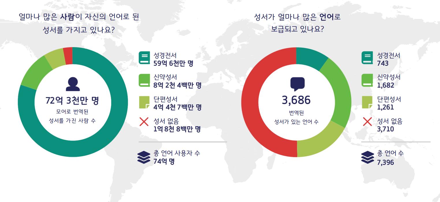 번역된 성서를 갖게 된 사람들은 4억 4천 7백 만 명입니다. 하지만 1억 8천 8백만 명의 사 람들이 사용하는 전 세계 언어 절반가량은 아 직 성서조차 번역되지 않았습니다. 그리고 14 억 6천만 명은 자신들의 언어로 된 성경전서 ▲ 2023년 세계 성서 번역 현황 인구, 언어 통계 1
