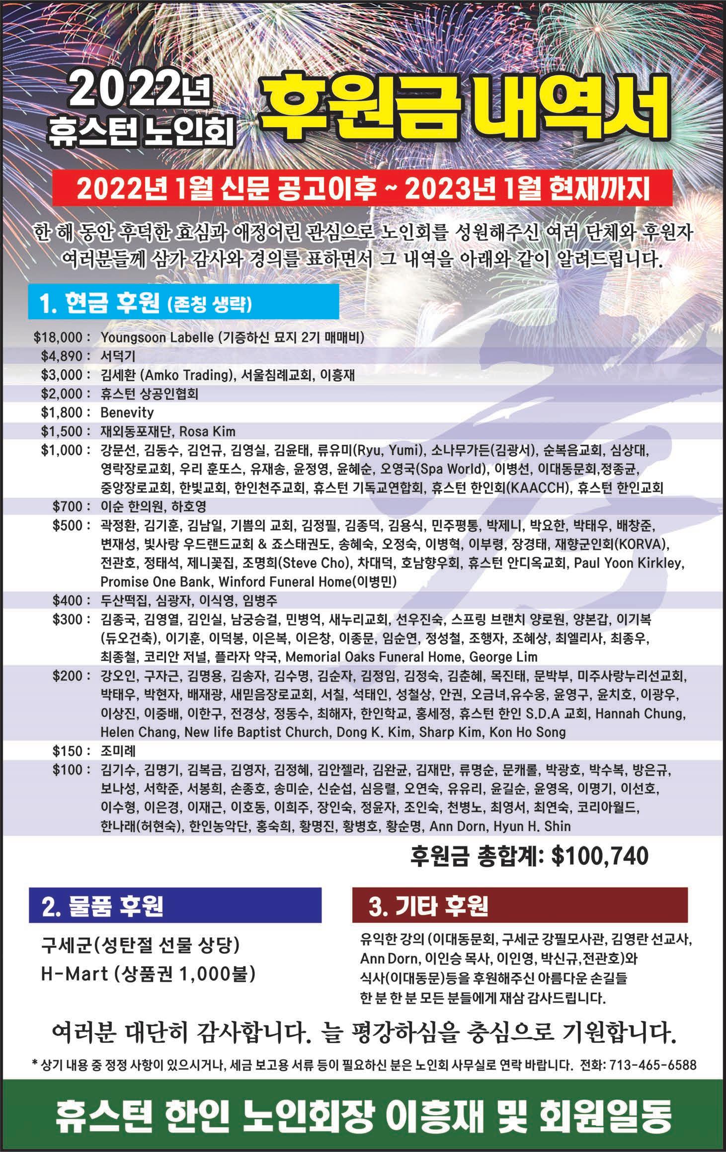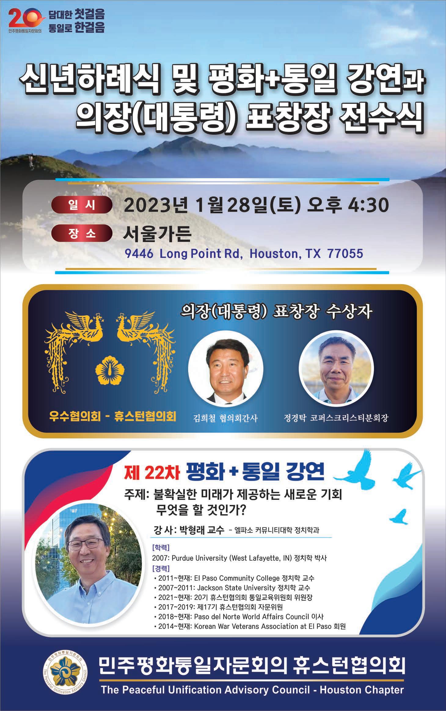 모 인 체육인들을 보면서 휴스턴 체 재미대한 휴스턴체육회 신년하례회 육회의 미래에 자신감을 갖게 된 다고 희망을 전했다. 유유리 체육회장은 계묘년 신 년 인사로 건강과 사업체 승승장 구를 기원하고, 특별히 미주체전 에서 좋은 결과를 거두기 위해 단 합을 당부했다. 4대 회장을 역임한 이상일 전 회 장(휴스턴 청우회
