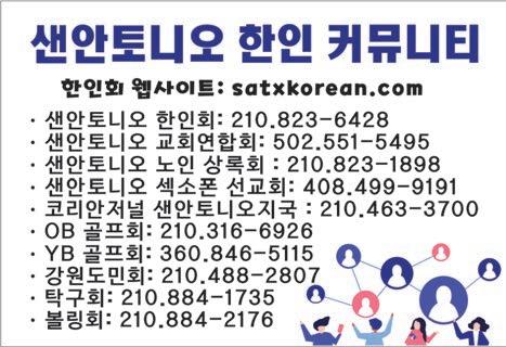 예술단삼색디딤(김미선)-----(832)722-4424 Katy크리스찬문화센터-----(832)407-2005 베트남참전국가유공자전우회(문박부) (832)482-5748 해병대전우회(이광우) --- (281)451-8297 휴스턴해군동지회(윤영구)---(713)294-2310 6.25참전국가유공자회 ----- (832)326-4620 특전전우회------------- (832)876-8111 휴스턴체육회(유유리)------ (832)274-6138 휴스턴골프협회(김용태) ----