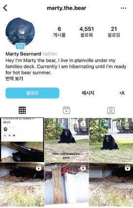 는 기색을 보이지 않았고 나와 눈 이 마주쳤을 때도 특별한 반응을 보이지 않았다. 아주 편안해 보였 다”고 덧붙였다. 난생처음 보는 광경에 다슈크위 치는 코네티컷주 에너지·환경보호 부(DEEP)에 연락했고 DEEP은 흑 곰이 마저 겨울잠을 자도록 놔두 는 것과 큰 소리를 내서 마루 밑에 서 쫓아내는 두 가지 선택지가 있 다고 답변했다. 다슈크위치는 “동면에 들어간 곰을 귀찮게 할 필요는 없고 우리 는 원래 뒷마당에 잘 나가지도 않 는다”면서 “곰이 우리를 귀찮게 하 지 않는 한 그냥 내버려 둘 것”이라 고 밝혔다. 다슈크위치는 마루 밑에서 잠든 이 곰의 모습을 찍어 틱톡에 올렸고 이 동영상은 조회 수 1천500만 건 이상을 기록했다. 그는 곰에게 ‘마티 베어나드’라 는 이름을 지어준 뒤 그 이름을 딴