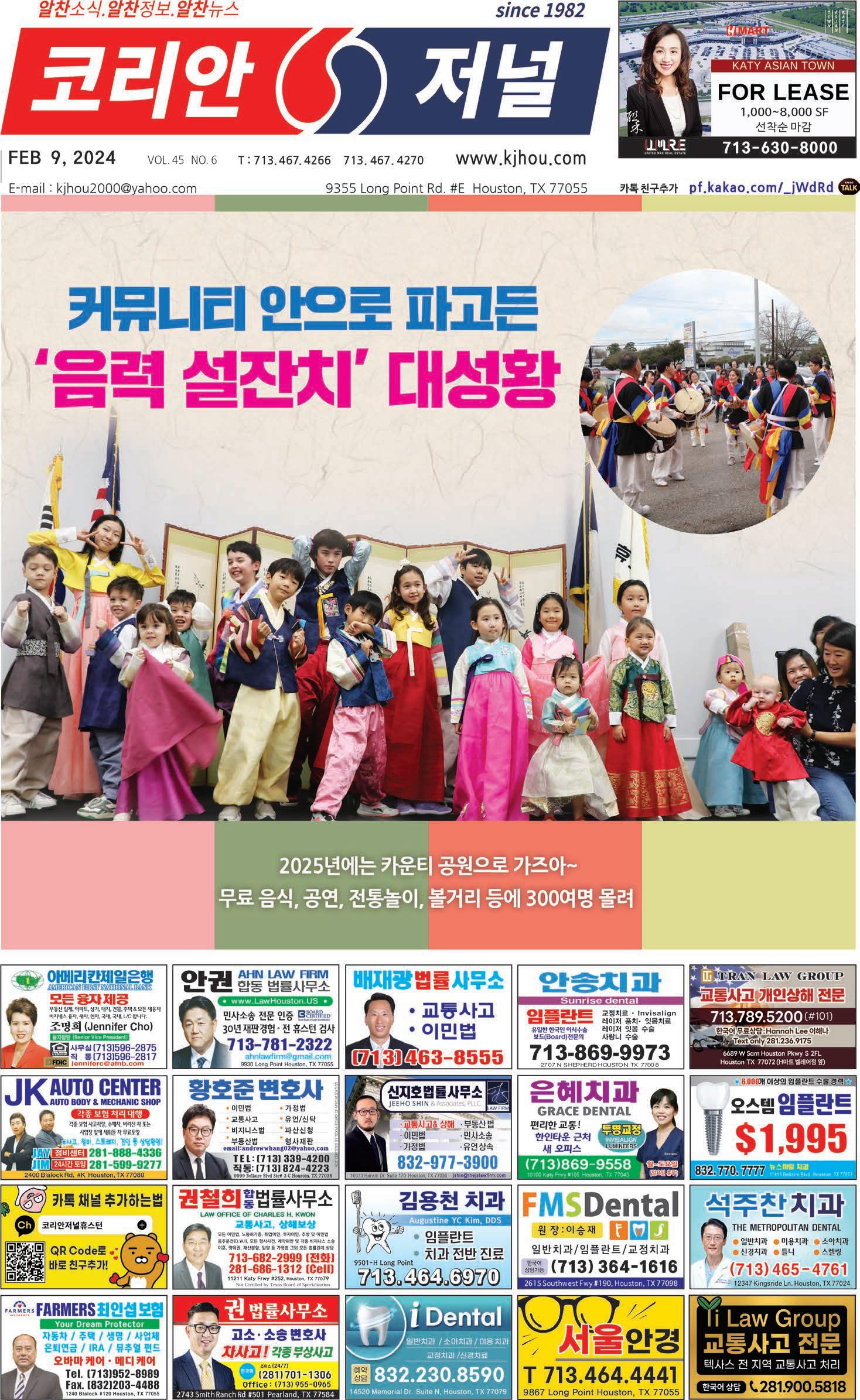 휴스턴 한인회가 민족 고유 명절 인 음력설을 맞아 지역 현지인들과 함께 하는 2024 음력설잔치(Lunar New Year & K-Food Festival)를 개최했다. 음력설을 일주일 앞당긴 2월 3일(토) 오전 11시부터 한인타 운과 인접한 트리니멘덴홀 커뮤니 티센터에서 오후 3시까지 설잔치 가 이어졌다. 전날 저녁부터 내리 기 시작한 굵은 장대비는 당일 오 전 9시까지 계속됐지만, 행사 1시 간 전 비도 말끔히 그치고 덥지도 춥지도 않은 상쾌한 봄날의 일기 를 보였다. 커뮤니티센터 안에는 탁구장을 비롯하여 다양한 액티비 티가 여전히 진행 중이었고, 한인 음력설잔치로 다소 시끄럽고 산만 할 수도 있었지만 누구하나 인상을 찌푸리는 모습은 보기 어려웠다. 한인천주교회 대건 농악단이 주 차장에서 힘찬 추임새로 개막을 알리자 건물 안과 밖에서 사람들