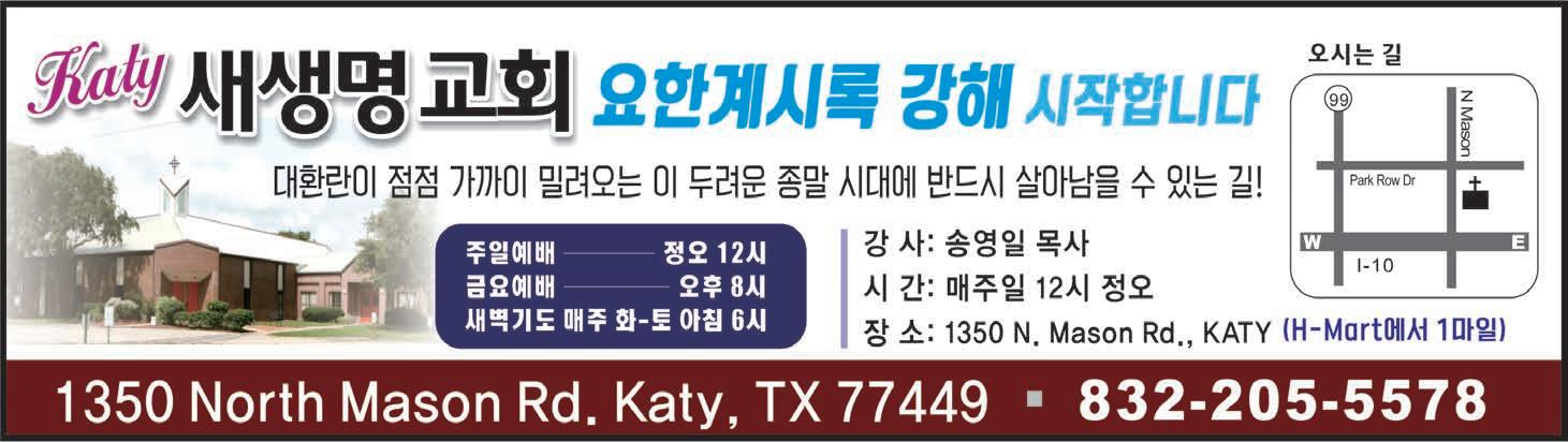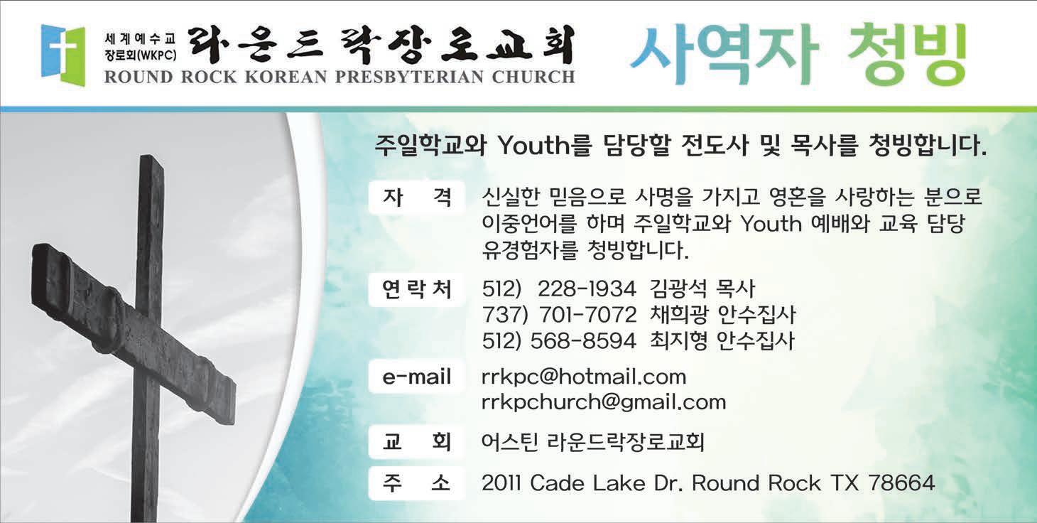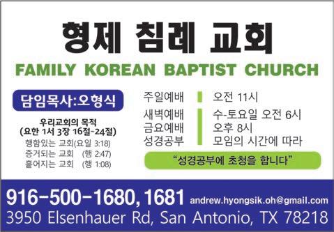 능력으로 되는 것 같으나 아닙니다. 하나님의 도우심이 없이는 불가능 합니다. 베드로의 삶을 보면서 깨닫 게 됩니다. 오순절에 3000명이 회개 한 역사는 베드로를 통해서 역사하 신 것입니다. 우리는 다만 쓰임 받 는 도구에 불과합니다. 나약한 베드 로가 초대교회의 용기 있는 지도자 로 변화되었습니다. 부족하지만 베 드로를 훈련시키시고 변화 시키는 데는 오랜 시간이 흘렸습니다. 우리도 부족하지만 하나님이 선 택하셔서 훈련의 과정을 통하여 하 나님의 일꾼으로 사용하십니다. 섬 기는 교회를 통하여 잘 훈련 받아 귀 한 일꾼 되시기를 축복합니다. 아멘 류복현 목사 (킬린한인침례교 담임) 254-289-8866