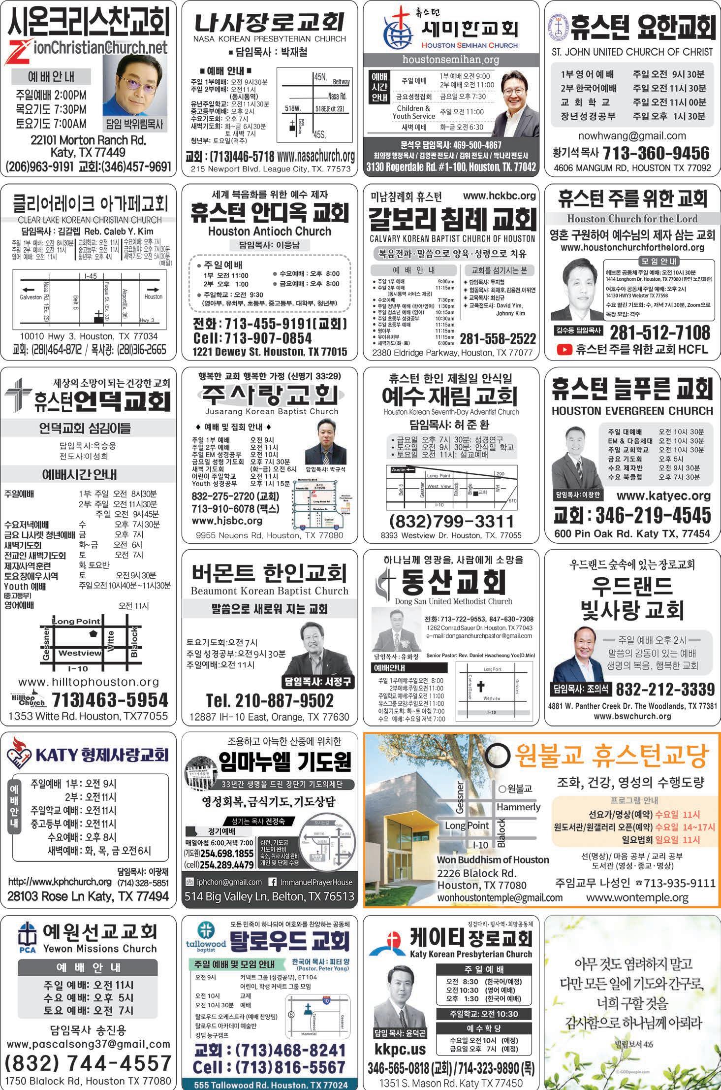 기독교교회연합회(송영일)-(832)205-5578 휴스턴한인목사회(이인승)--(832)264-9566 남선사(신도회장 김홍표) -- (713)467-0997 정토회------------------ (832)798-3357