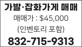 -CM치킨 급매 ---(713)584-0909,(281)716-0870 -메모리얼 옥 묘지 2기 팝니다 / 한인교회 소재 -------------------------(713)826-5951 -트럭 운전하실 분 (Class B 면허소지자)/버몬트지역 -------------------------(409)460-6849 -교회 베이스 기타 리스트 모집 -------------------------(206)963-9191 -뷰티서플라 & 잡화가게 매매 / $30,000 -------------------------(713)330-6858 -뷰티서플라이 장비(선반, 마네킹, 훅 등등) -------------------------(832)725-4440 -스시바쇼케이스/활어수족관 싸게 파실 분 연락주세요 -------------------------(248)971-4419 -나비(NaBi) 플로리스트 / 오스틴 -------------------------(512)383-5140 -묘지매매 원합니다(메모리얼 묘지/ I-10 & 엘드리지) -------------------------(832)741-2055 -묘지 3기 매매 가격 협의 가능 (문자요망) -------------------------(281)788-9102 -시온 크리스챤 교회 반주자 구함 -----------------(메세지) (713)298-9948