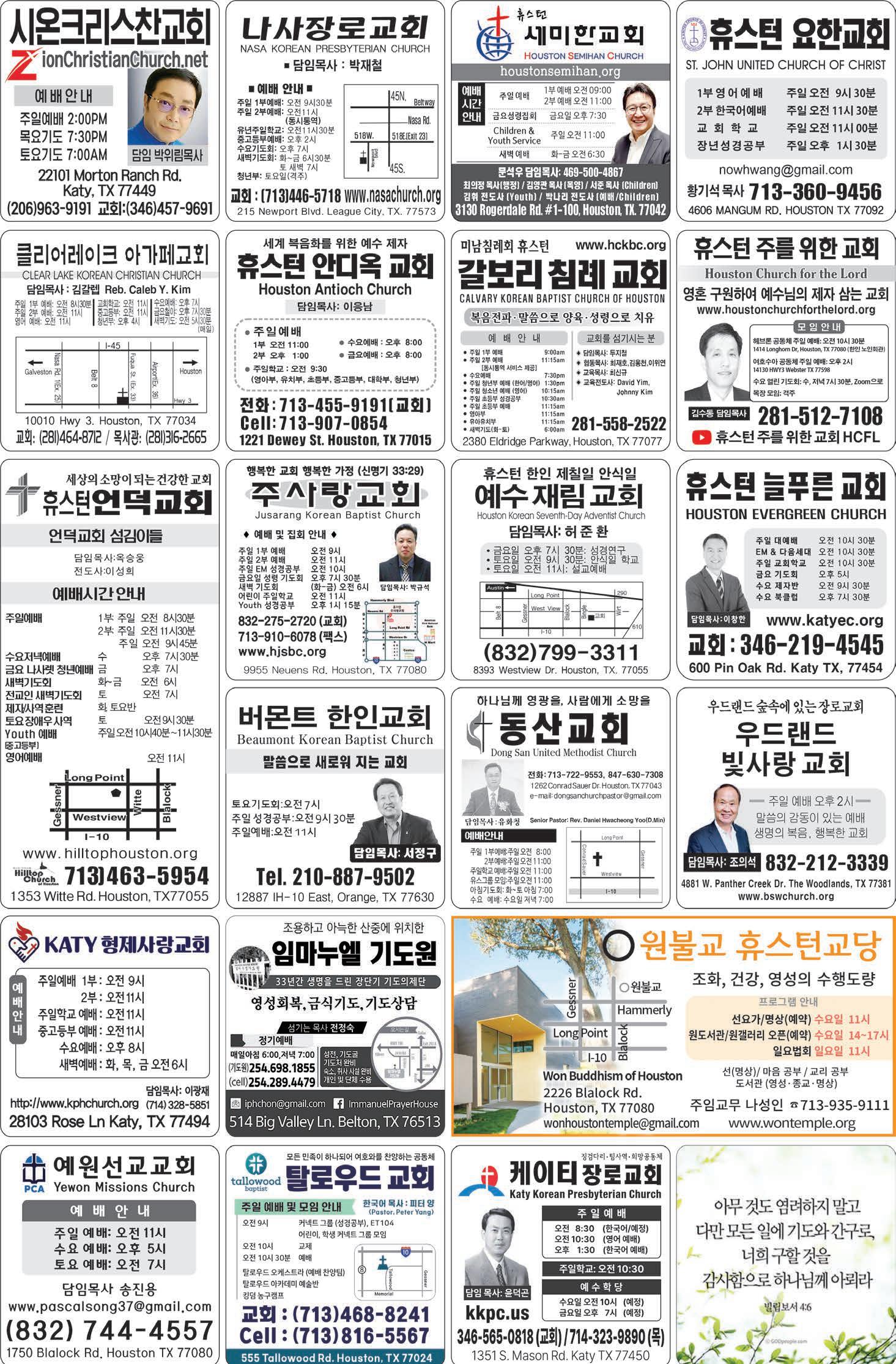 기독교교회연합회(송영일)-(832)205-5578 휴스턴한인목사회(이인승)--(832)264-9566 남선사(신도회장 김홍표) -- (713)467-0997 정토회------------------ (832)798-3357 한미애국기독인연합회(원관혁) (817)773-2348