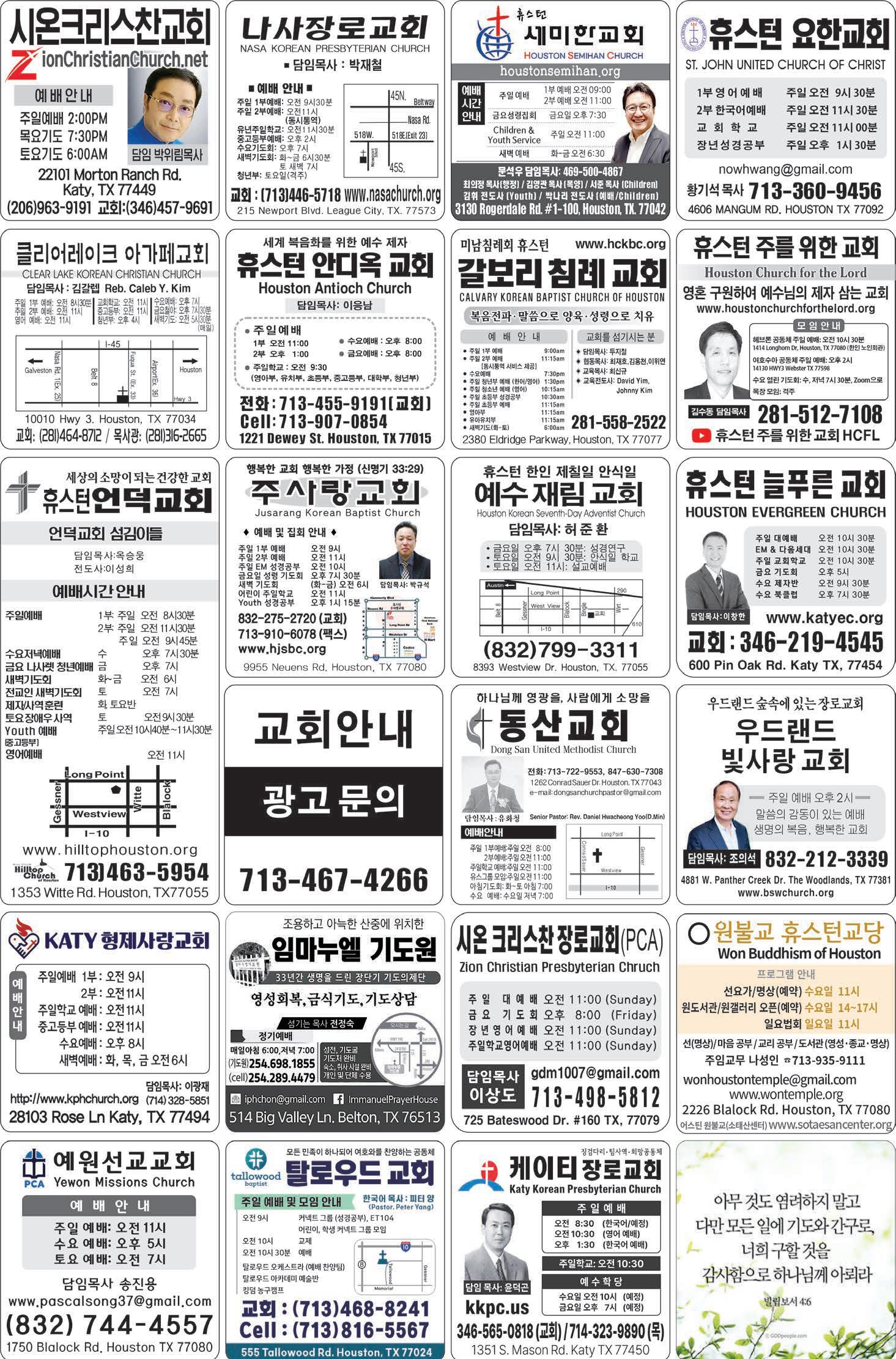 기독교교회연합회(송영일)-(832)205-5578 휴스턴한인목사회(이인승)--(832)264-9566 남선사(신도회장 김홍표) -- (713)467-0997 정토회------------------ (832)798-3357 한미애국기독인연합회(원관혁) (817)773-2348