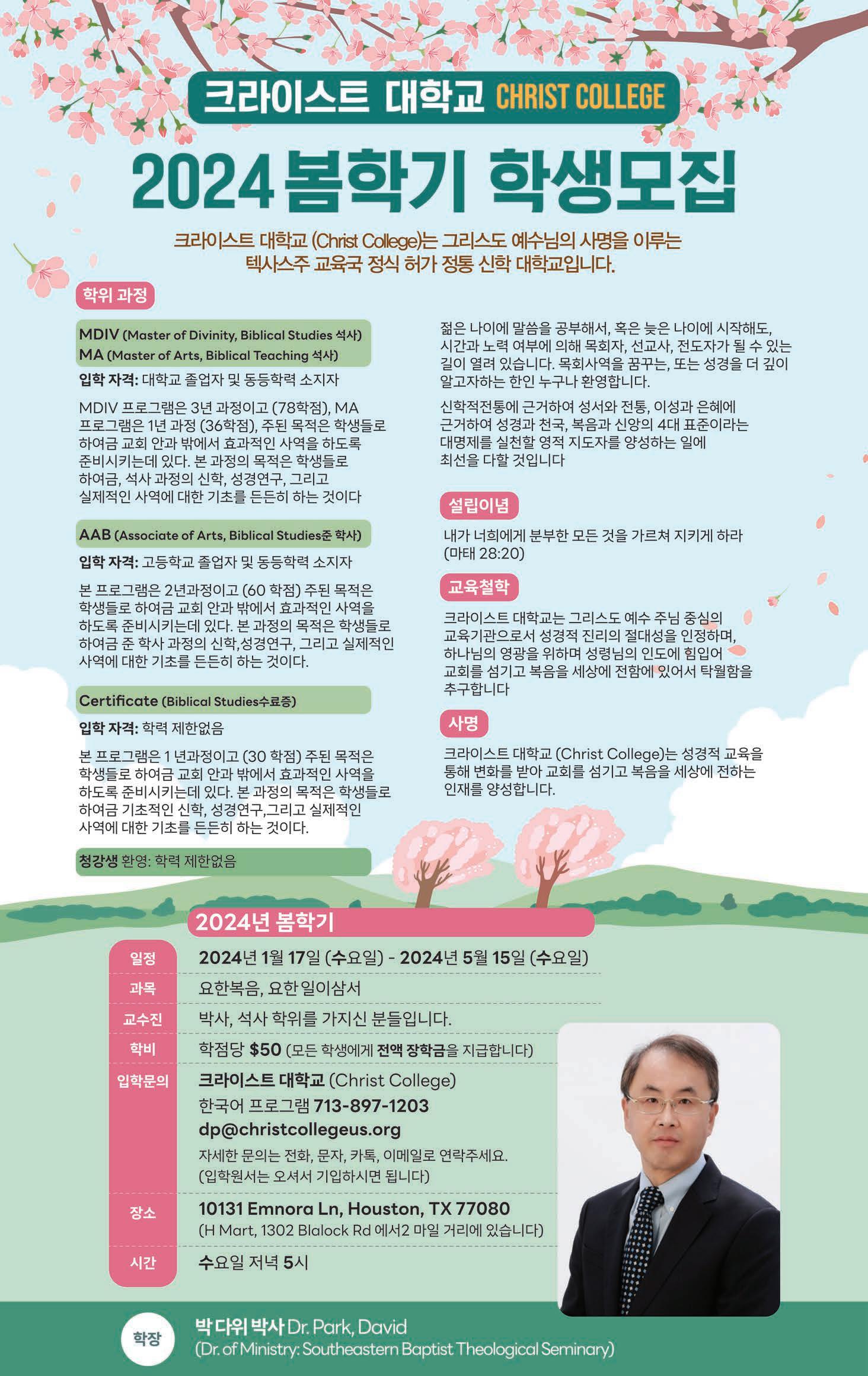 솔로몬은 예배를 통하여 하나님 께 구한 것은 지혜입니다. 그러나 하나님은 그가 구하지 않은 것 부 귀영화도 함께 주셨습니다. 예배 의 성공자가 되어 하나님을 기쁘 시게 하시고, 인생의 성공자가 되 시기를 축복합니다. 아멘 류복현 목사 (킬린한인침례교회 담임목사) 254-289-8866