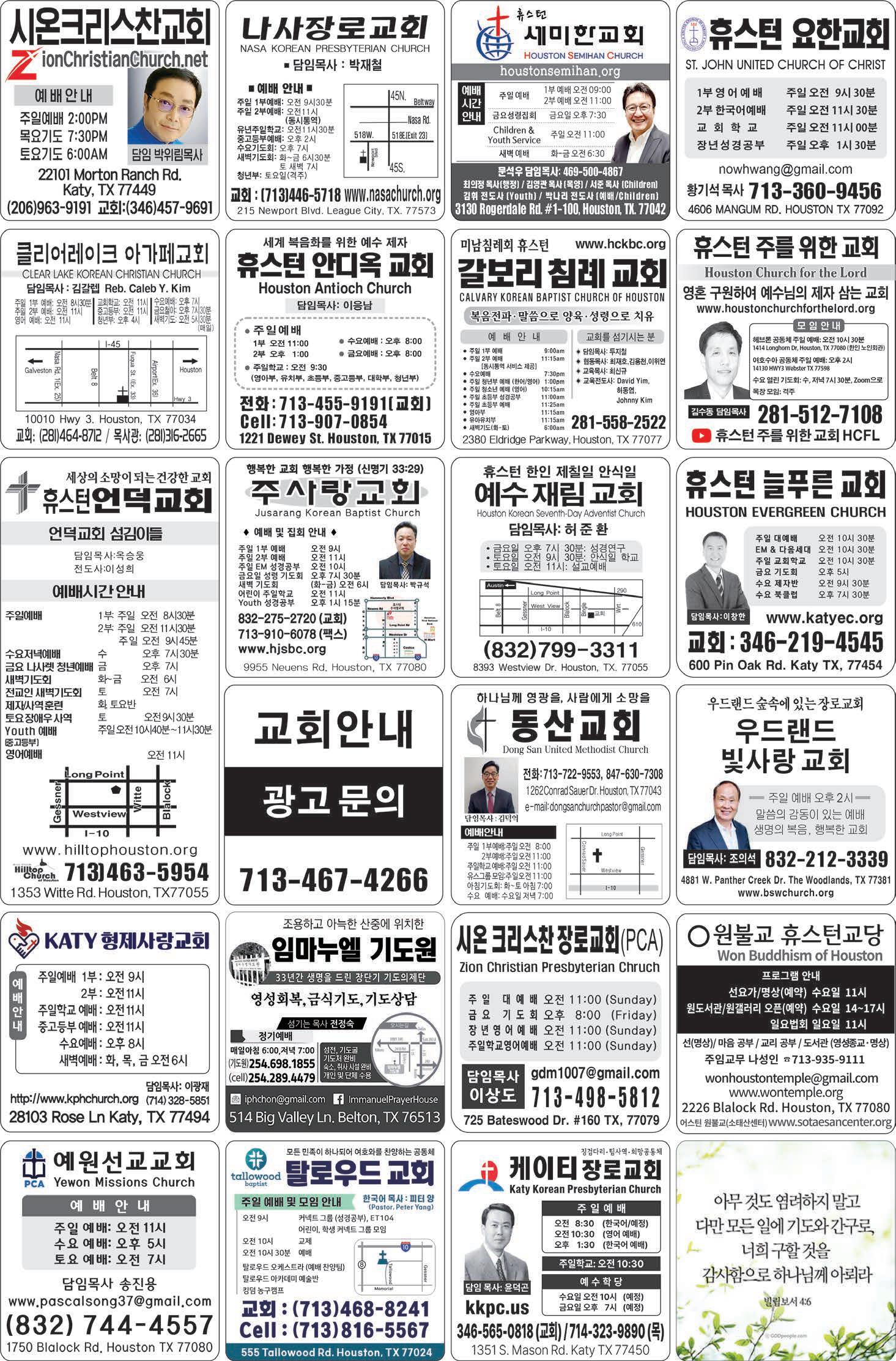 기독교교회연합회(송영일)-(832)205-5578 휴스턴한인목사회(이인승)--(832)264-9566 남선사(신도회장 김홍표) -- (713)467-0997 정토회------------------ (832)798-3357 한미애국기독인연합회(원관혁) (817)773-2348