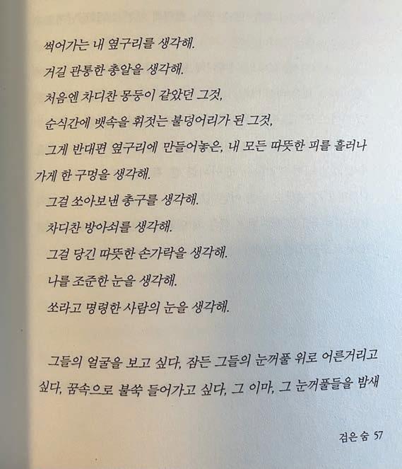 야 한다. 한강의 이번 수상으로 한 국인이라는 자부심도 들었지만, 내 가 속물인지라 과거정부의 과오를 증명해 주는 것 같아 통쾌하기도 했다”고 말했다.