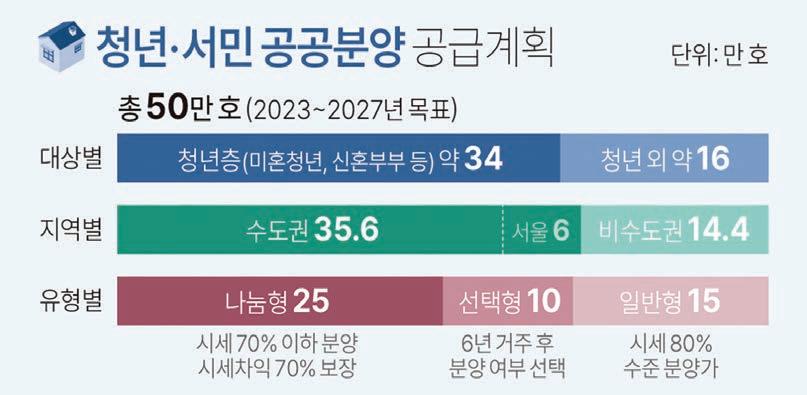 주택구입자, 다자녀, 노부모 부양자 등 기혼자 위주로 운영해 미혼 청 년은 소외된 점을 고려했다. 신혼부부 공급은 15만5천호·생 애최초 공급은 11만2천500호로, 청년·신혼부부 특공과 생애최초 공급 중 일부 물량을 더하면 청년 층에게 34만호가 돌아간다고 정 부는 밝혔다. 공공분양은 나눔형(25만호)·선 택형(10만호)·일반형(15만호) 세 가지 유형으로 나눴다. 나눔형은 시세의 70% 이하, 건 설원가 수준으로 분양하는 윤석 열 대통령의 대선공약인 ‘청년원 가주택’과 ‘역세권 첫집’ 모델을