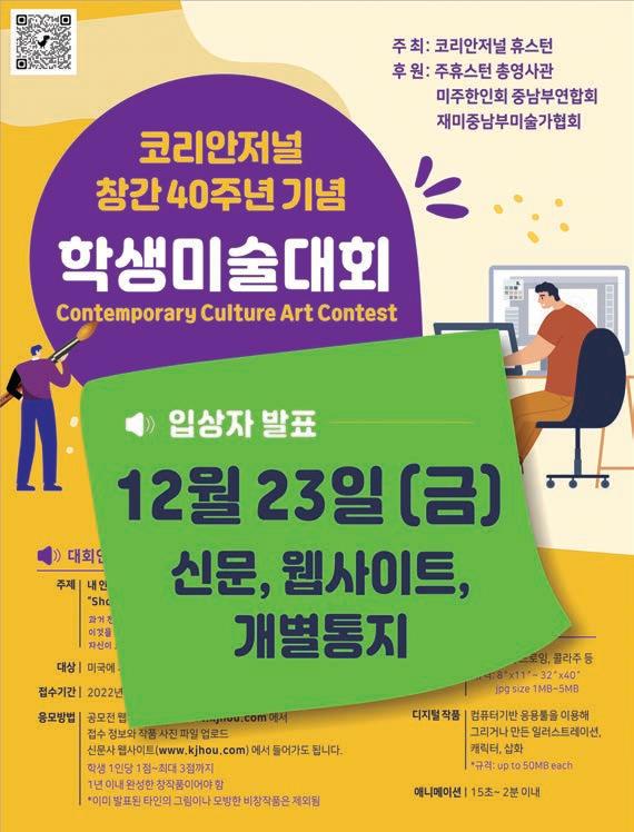 구축해 작품 접수부터 온라인 갤 러리 공간까지 마련, 운영함으로 써, 팬데믹으로 대회 취소나 축소 의 빌미를 삼지 않고 오히려 지역 미술대회를 체계있게 만드는 계기 로 삼았다. 단, 100% 온라인 대회로 전환 하는데는 홍보 기간이 필요했으 며, 팬데믹의 장기화도 대회에 영 향을 미치면서 결국 1년의 공백기 를 갖고 올해 13회 공모전으로 대 회 역사를 이어갔다. 올해는 코리안저널의 창립 40주 년을 기념하면서 미래 지향적인 대