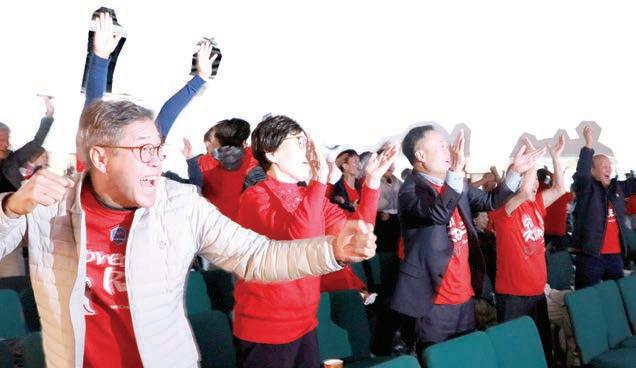 것처럼 화면을 응시했다. 둘째날인 11월 28일(월)은 출근 과 학교 등교 등으로 1차전만큼 응 원단이 모이지 못했지만 100여명 이 한 수 아래로 평가되는 가나전 에서의 통쾌한 승리를 기대하는 모 끝까지 “대~한민국!” 월드컵 응원 일심동체 한인회관 울린 응원소리 북소리… McDonald’s 도 후원 경기 승패 관계없이 동포사회 응집력 보여줘 습이었다. 그러나 가나팀은 전반전 을 2골로 앞섰다. 휴스턴 응원단은 구호를 외치며 벤투호의 선전을 기 원했다.