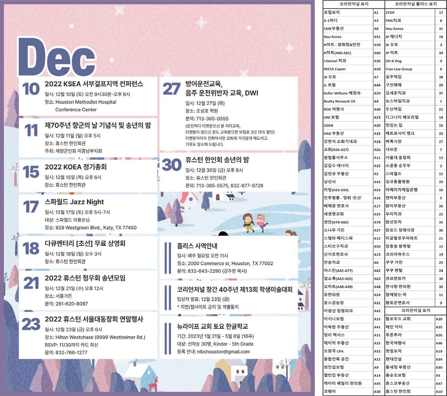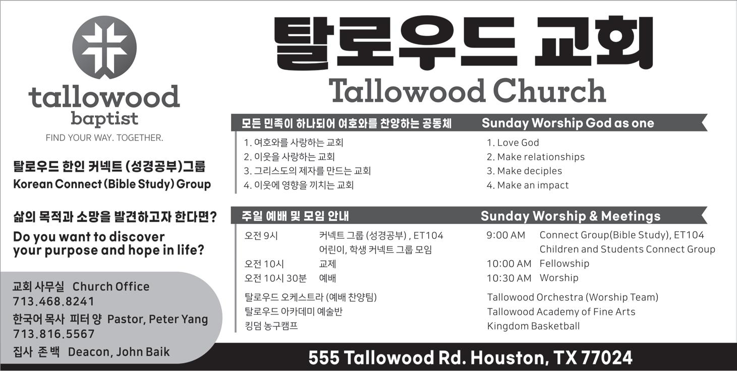 광고안내표 재미한인의학협회남서부지부 ----- (713)861-8188 한미에너지석유기술협회-------- (713)301-2020 한미석유가스엔지니어협회 (정철균) ---------- 휴스턴총영사관(안명수) --- (713)961-0186 민주평통휴스턴(박요한) --- (832)919-4404 한국교육원(양은미)------ (713)961-4104 향군미중남부지회(정태환)-- (832)326-4620 재미남서부미술가협회 ------- (713)885-7119 화요수채화(이병선) -------(832)483-7979 한얼 국악단(양진석)-------- (713)894-1425 농악단/한나래(허현숙) ------