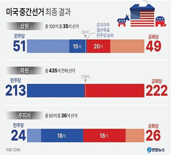 주요 법안 표 결 시 1표라도 이탈표가 나올까 봐 노심초사했다. 하지만 이번 중간선거에서 민주 당은 상원 의석을 1석 더 확보함에 따라 1표의 이탈표까지는 감내할 수 있게 돼 바이든 대통령은 훨씬 정치적 부담을 덜게 됐다. 다만 이번 중간선거 결과 하원 은 야당인 공화당이 장악해 바이 든 행정부의 집권 후반기 2년간 미 의회는